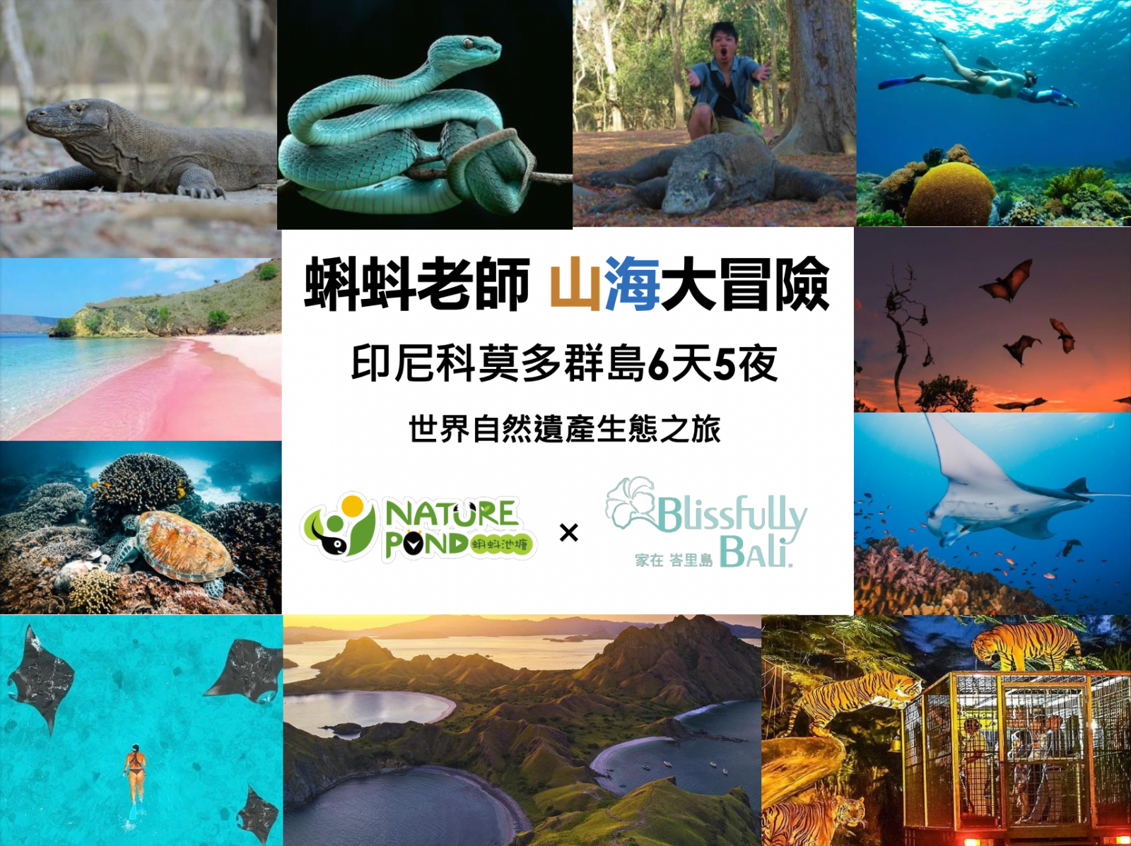 這次Blissfully Bali 將與蝌蚪老師聯手,用最專業最安全最好玩的設計帶領著所有大小朋友,踏上俗稱的香料群島的生態島嶼,去拜訪全世界僅有少處才能見到的粉紅沙灘 瀕臨絕種的科莫多巨蜥還有一片多采多姿的海底世界,這趟旅行絕對是是結合野性跟知性的生態之旅。