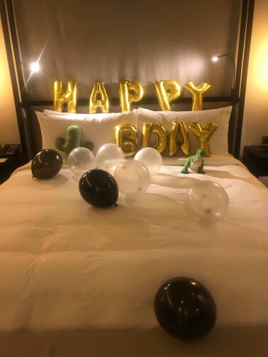 事情總有出乎意料的地方……飯店因為公安考量禁止任何會飛的氣球,讓我對氣球已不抱任何希望,但Teresa總是有辦法讓事情變好。我還是有氣球可以佈置房間,而且還換到了更高級的飯店(笑)