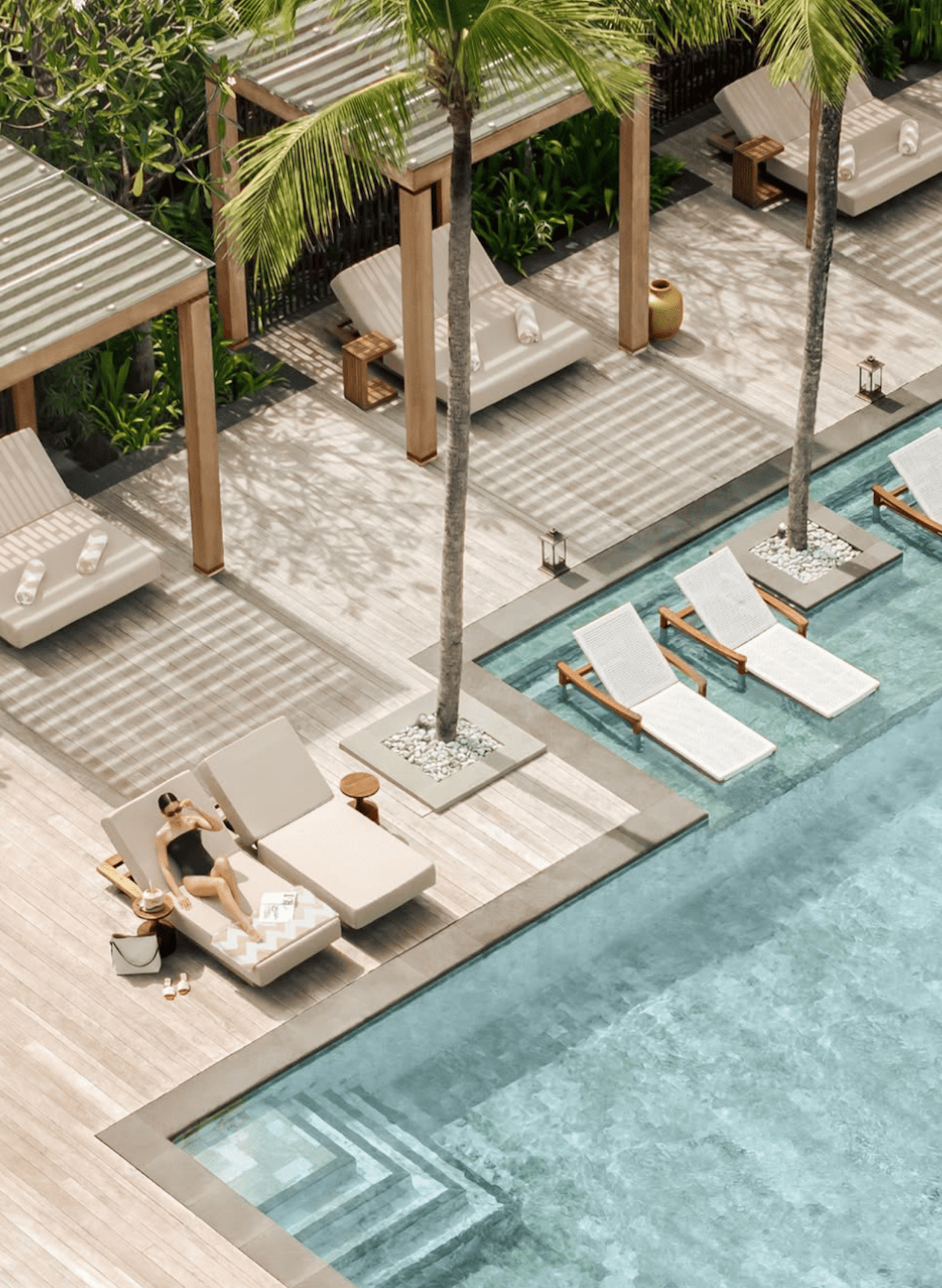 渡假村最奢華的房型「兩房海景頂層豪華套房(Two Bedroom Penthouse Oceanfront with Private Pool)」,擁有 618 平方米的寬敞起居空間,並具備設備齊全的廚房、私人露台以及30平方米的無邊際泳池,可俯瞰壯麗的印度洋景色。